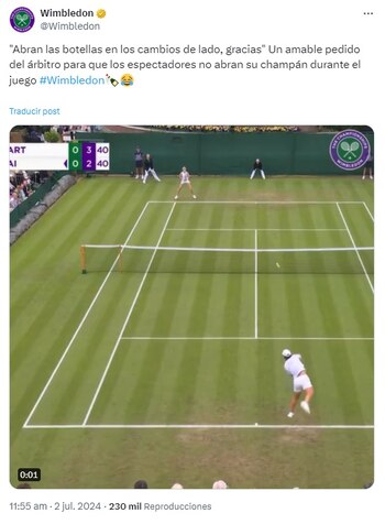 “Se ríen en dinero”, “¿Pero como dejan meter en un evento deportivo una botella de cristal y con alcohol? No entiendo”, “Solo quiero ser unos de ellos”, “Si eso sucede en un estadio de fútbol en latam estaríamos hablando de una tragedia con heridos y arrestados”, “Qué ganas de estar en Wimbledon y destapar una botella de esas. Qué lindo”, “No se debería permitir, directamente”, fueron algunos de los comentarios de los usuarios en la red social.