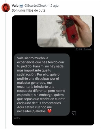 El mensaje de la aplicación concluía: “Quiero pedirte disculpas por el malestar generado. Me encantaría brindarte una respuesta diferente pero no me es posible. Sin embargo, quiero que sepas que tendré en cuenta cada uno de tus comentarios. Aquí estaré cuando me necesites. Saludos”, acompañado de un corazón. Esta falta de solución efectiva hizo que Vale reaccionara negativamente y decidiera exponer la situación en las redes sociales, lo cual llevó su publicación a hacerse viral.