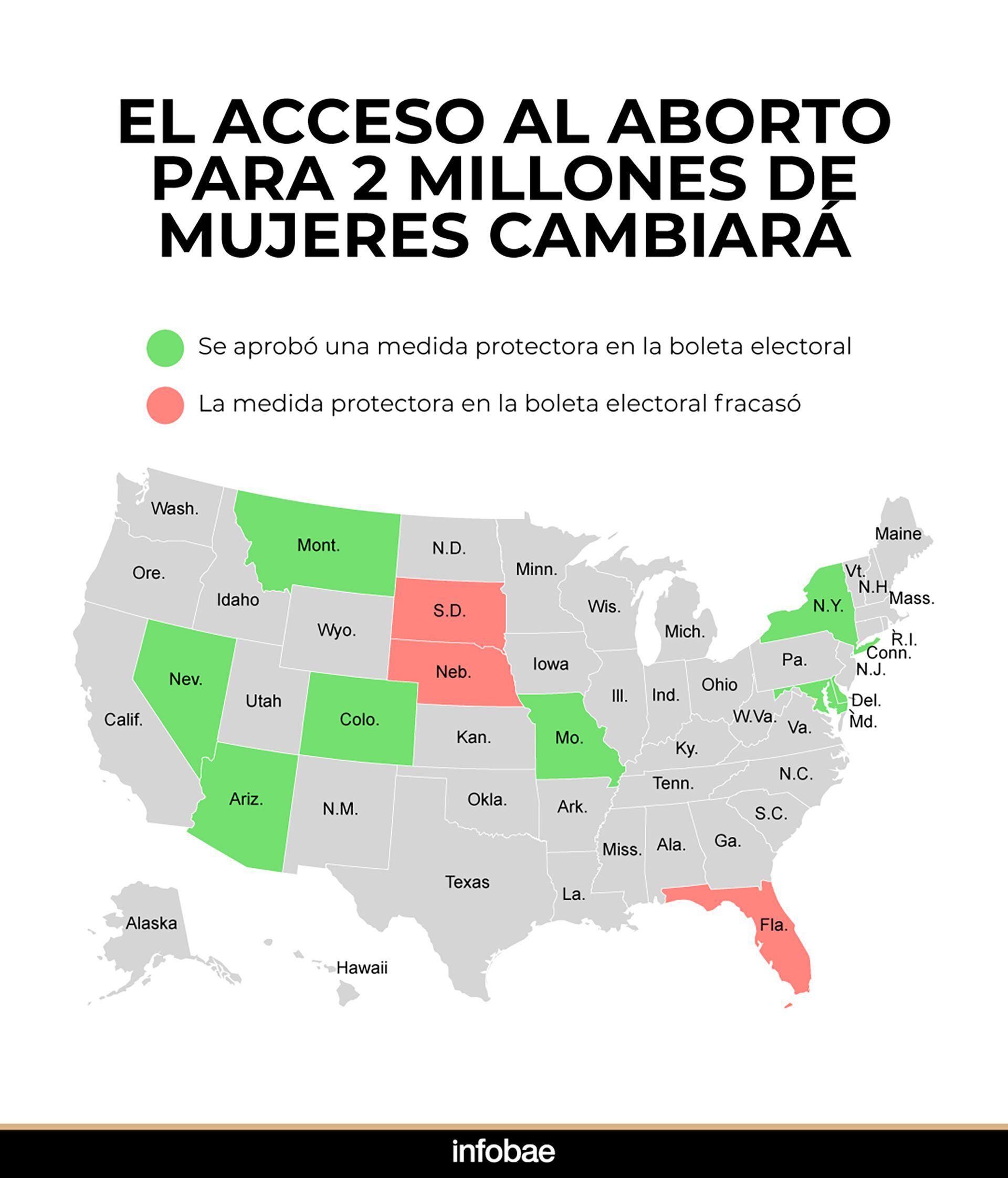 Todas las medidas propuestas, menos tres, destinadas a preservar o ampliar el acceso al aborto fueron aprobadas. Las medidas en Florida, Nebraska y Dakota del Sur no lograron obtener el apoyo necesario para ser aprobadas, lo que marca la primera vez que los votantes de cualquier estado rechazan tales iniciativas desde que la Corte Suprema revocó el fallo Roe v. Wade en junio de 2022.