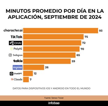 Mientras las empresas de inteligencia artificial luchan por convencer al público de que los chatbots son herramientas empresariales esenciales, un público cada vez mayor pasa horas construyendo relaciones personales con la IA. En septiembre, el usuario medio de la aplicación de compañía Character.ai pasó 93 minutos al día hablando con uno de sus chatbots generados por el usuario, a menudo basados en personajes populares del anime y los videojuegos, según datos globales sobre dispositivos iOS y Android de la empresa de inteligencia de mercado Sensor Tower.